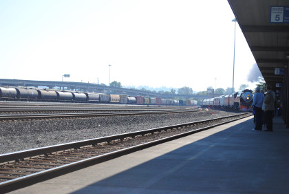 My last morning in Lynnwood I arose early, checked the e-Mail then had a good breakfast before Bob and Elizabeth drove me to the Tacoma Amtrak station (they would follow in the car to Portland) and I picked up my boarding pass for the Southern Pacific 4449 trip to Portland, the final event of this year's National Railway Historical Society convention. I met Bob Riskie to give him my extra route guide from the trip on Tuesday. After socializing on the platform, I set up to catch the steam engine pulling the train into the station.