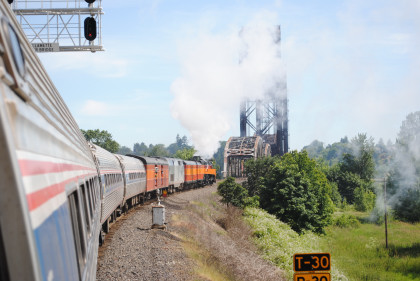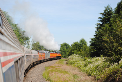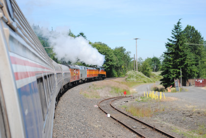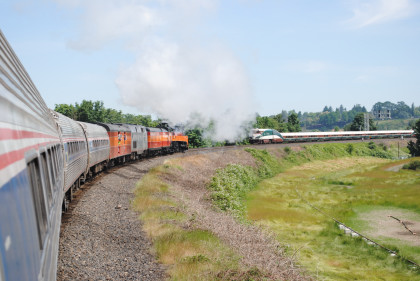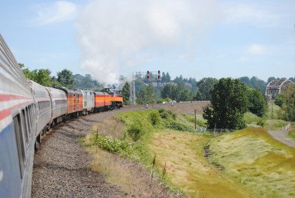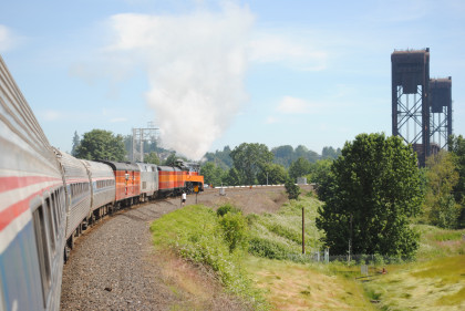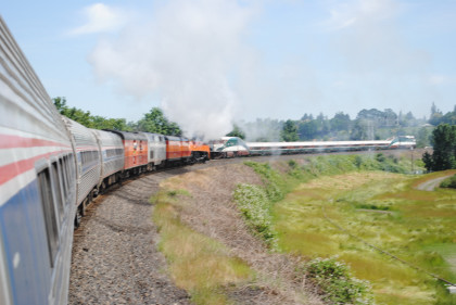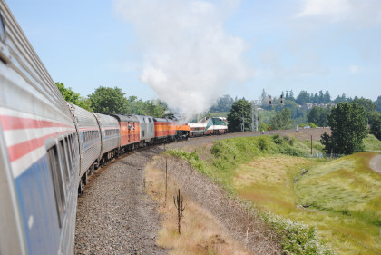Southern Pacific 4449 passed Amtrak Cascades 501 as it took the big curve to cross the Willamette River, after which I returned to my seat.