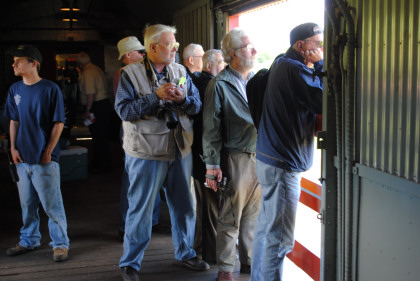 The passengers enjoying the baggage car's open door and the sounds of Southern Pacific 4449 climbing Vader Hill. At Vader we crested the hill and started down the north side of it.