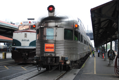 The rear of our train today whose consist was Southern Pacific 4-8-4 4449, Auxiliary Tender DLMX 4219, Amtrak P42DC 202, baggage/concession DLMX 5659, Amfleet coaches 82540, 82720, 82510, cafe/business class 58107, Amfleet coaches 82560 and 82620, San Luis and Rio Grande full dome 511 "Nenana" 800124, Santa Fe short dome "Plaza Santa Fe" 503 800392, California Zephyr "Silver Lariat" 800190 and California Zephyr dome/observation CZ10 "Silver Solarium" 800038.