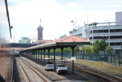 Tacoma 6/21/2011I checked my suitcase in with the Amtrak agent for three dollars, then boarded a school bus for the trip to the Hotel Murano and went upstairs to the registration room for Cascade Rails 2011 Convention and Ed Graham checked me in, handing me my tickets and goodie bag. I walked to the Tacoma Light Rail and north to the end of the line and two miniutes later, the train arrived which I boarded for the 1.5 mile trip back to Freighthouse Square.
