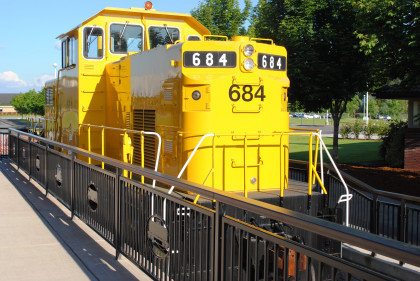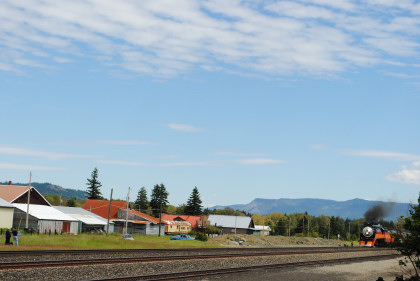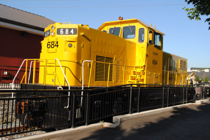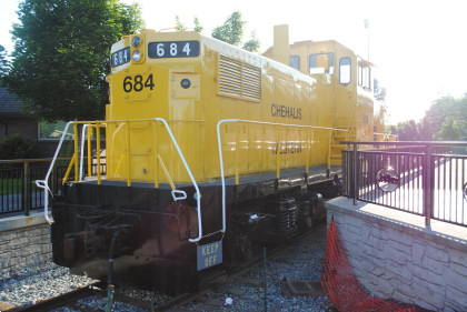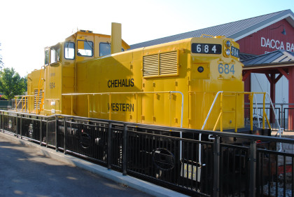 Chehalis Western C415 684, ex. Curtis, Milburne and Eastern 684, built by American Locomotive Company in 1968. The lines ran log trains from Western Junction in the Tenino area to the Port of Tacoma. These trains made a reverse move when they entered the Union Pacific switch yard in Fife on their way to the Tacoma Rails main yard in the Port. Here the trains were delivered to a trans-loader for overseas shipment. This operation ran from 1980 to 1992.