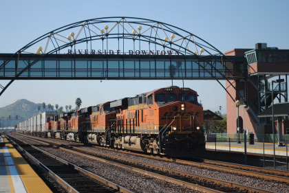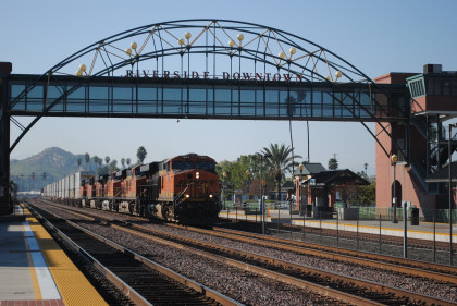 A westbound BNSF freight came through Riverside just as we started to move towards San Bernardino. When we arrived there, I spotted one of Metrolink bicycle cars.