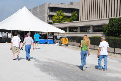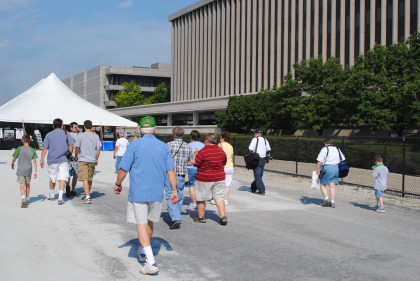 People walking to the vendor tent or to see the engines.