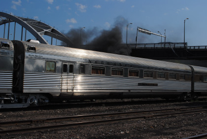 Chicago, Burlington and Quincy power car/coach 960 "Venus" built by Budd Company in 1936. At the front of the car are three diesel engines which power the lights and air conditioning for the entire train. As built, the rear of the car featured a bar and lounge area but this was later changed to a coach seating section. The "Venus" is articulated at its rear, which means that it shares a truck with the car behind it and cannot be uncoupled at that end.