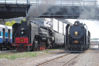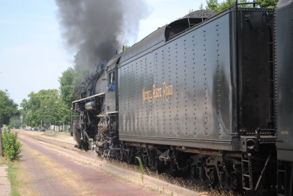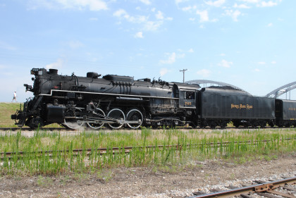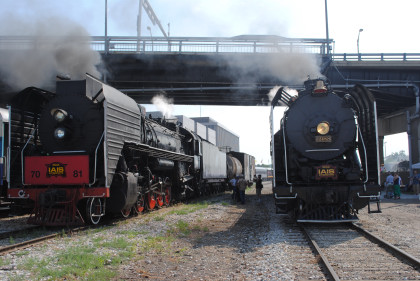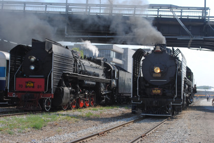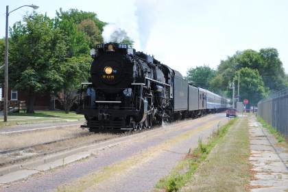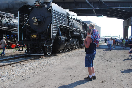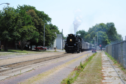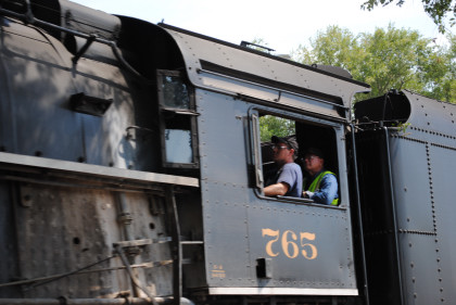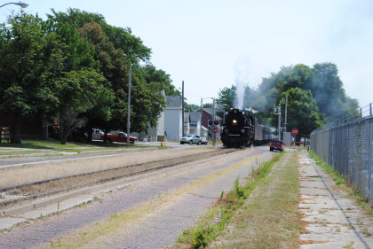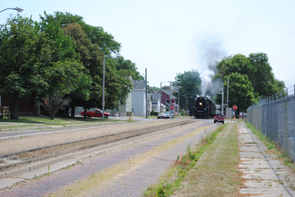 Iowa Interstate QJs 7081 and 6988. With that, we met Bob and Elizabeth, whom I told about the coolest spot in Rock Island then Nathan and I left the grounds and drove to Davenport, Iowa to catch Nickel Plate 765 pulling the 11:00 AM train to Walcott, Iowa. We waited and the train started towards us but stopped at a fire truck to top off the tender then headed for us.