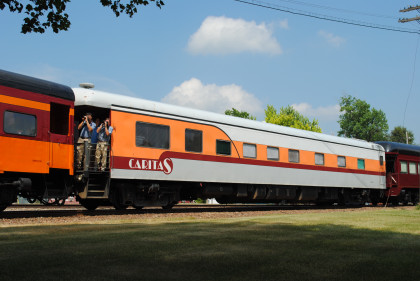 High Iron Travel's open-end observation/business car "Caritas", ex. VIA 2095 "Churchill Falls", ex. Canadian National 2095 "Churchill Falls, nee St. Louis-San Francisco 14 roomette/4 double bedroom sleeper 1450 built by Pullman in 1948. PPCX 800045.