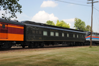 Chicago, Burlington and Quincy dining car 150 "Ceres" built by Budd Company in 1936 and designed with a built-in kitchen where full meals were cooked and prepared while moving. The car is articulated at both ends, which means that it shares its trucks with the adjacent cars in the train and cannot be uncoupled. The kitchen is fully functional, including its coal-fired stove and has been used many times to provide meal service on the train, both during special events at the Illinois Railway Museum and during excursions to other destinations using the Nebraska Zephyr.