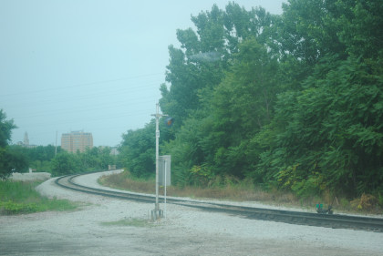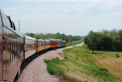 After the Iowa River, the view ahead. We proceeded to Homestead and then out to wye where we pulled down past the switch to reverse around the northwest leg of it so the train would be in the correct position for the return to Rock Island.