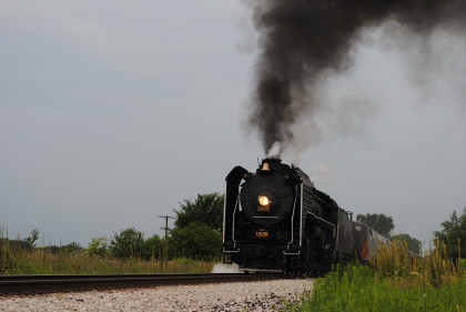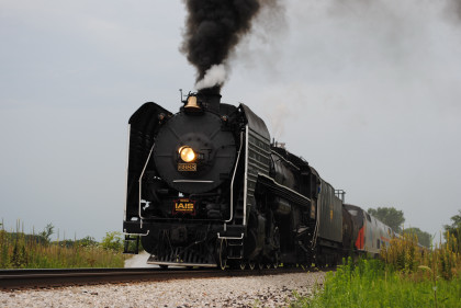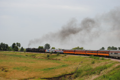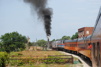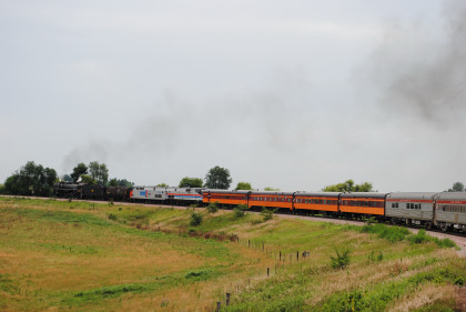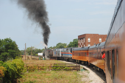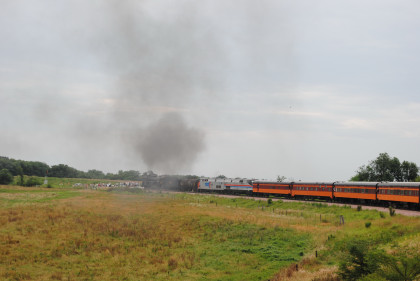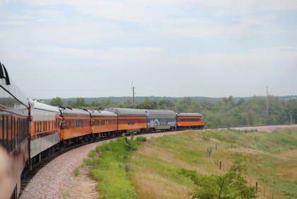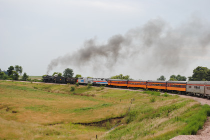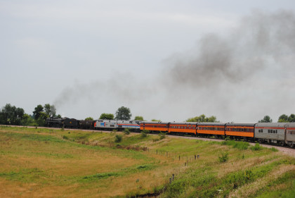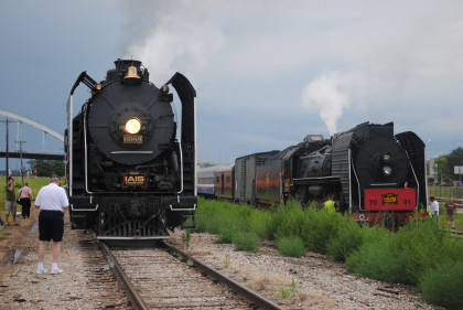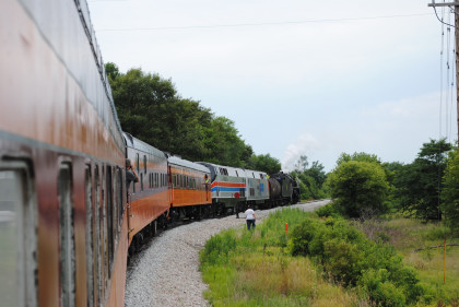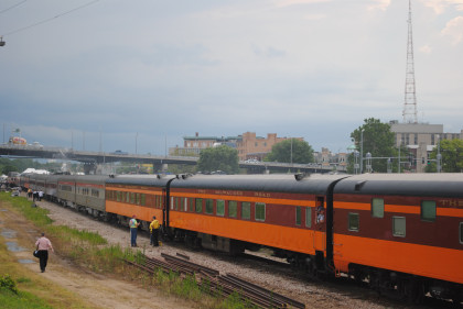 After a good breakfast at Denny's, the five of us we drove down to the parking structure in downtown Rock Island before we walked to the Train Festival 2011 grounds. Bob Riskie and I walked down to the train to Iowa City and boarded the coaches, taking a seat in the front coach. Our train consisted of Iowa Interstate QJ 2-10-2 6988, water car, Amtrak P42 156 Heritage Unit, Amtrak P42 156 Heritage Unit, "Grand Canyon", "Minnesota River", NRS 203 "Nokomis", NRS 202 "Wenoneh", "St. Paul Pass", "Lake Pepin", "Arizona", Milwaukee Road 261 concession car 2450, "Lamberts Point", "Caritas", "St. Croix River", "Wisconsin Valley", "Super Dome", "Nenana" and "Cedar Rapids".