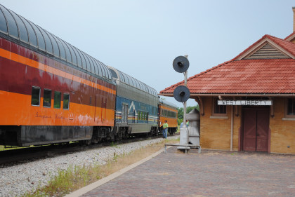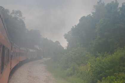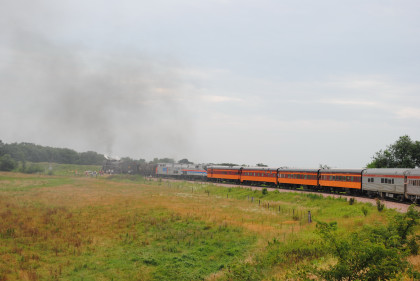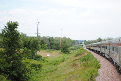 The car I was riding in was North Star Rail 68-seat chair car 203 "Nokomis", ex. Algoma Central Railway 443, exx. Central of Georgia 672, nee Central of Georgia 542 built by American Car and Foundry in 1947.