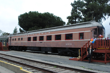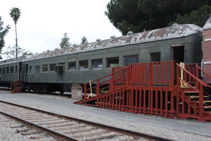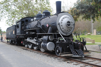 The giant locomotive and its 25 1/2 ton tender, which in their heyday pulled several "presidential specials" during campaign sweeps across the nation, now stands on a strip of track at Travel Town, and visitors may enter the engine's cab, examine the controls, and tug the cord which clangs its big brass bell.