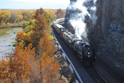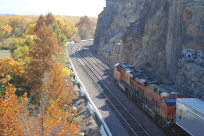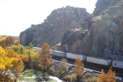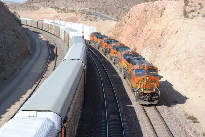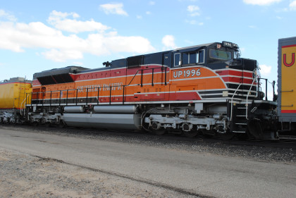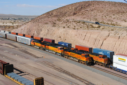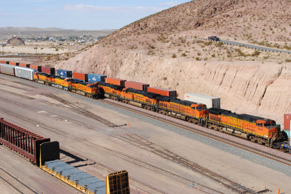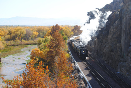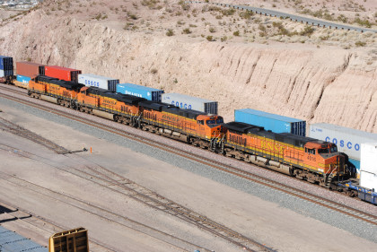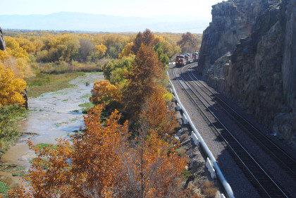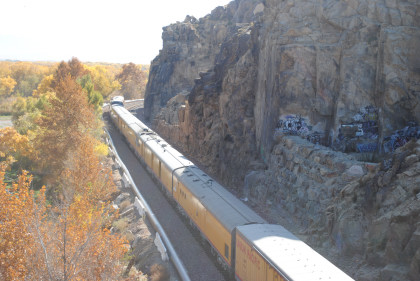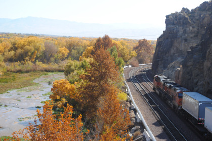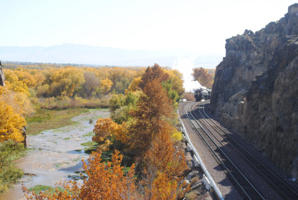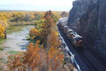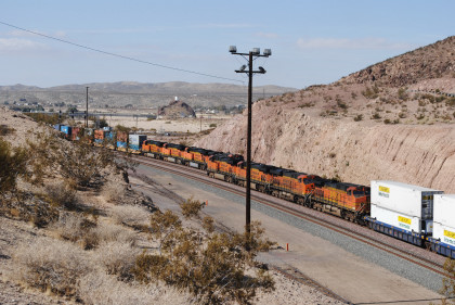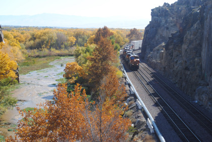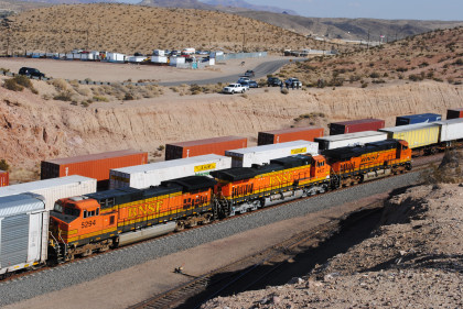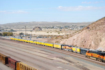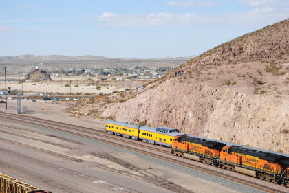 Union Pacific 844 came through the Upper Mojave Narrows before meeting a westbound BNSF train at Victorville.