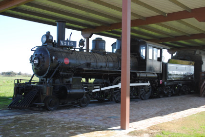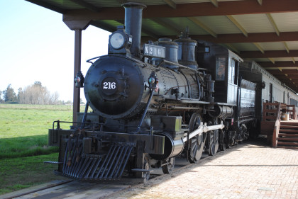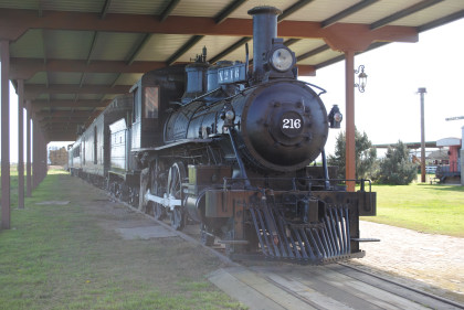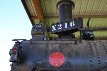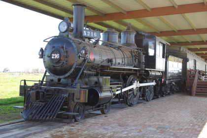 Southern Pacific 4-4-0 216 built by Baldwin in 1887. In 1904, it was sold to the Southern Pacific where it became Morgan's Louisiana & Texas 246. In 1913, 246 was renumbered 216. In 1929, the steam engine was sold to the Erath Sugar Company and worked the seventeen mile line into the cane fields at the company's Erath plant and the Vermilion plant near Abbeville, Louisiana. Retired in 1956, it was sold to Nelson F. Blount to join the Steamtown collection. In 1996, 216 was donated to the Nevada State Railroad Museum who transferred it to the Feather River Rail Society. In 2003, the Double T bought the locomotive.