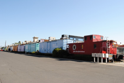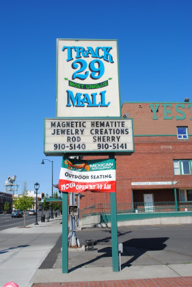 Track 29 Mall CollectionThe sign along Yakima Avenue for the outdoor shopping centre, Track 29, which was a series of businesses housed in boxcars connected by wooden walkways. It existed for a little over twenty-five years but most of the equipment was demolished in 2013 upon closure of the site.