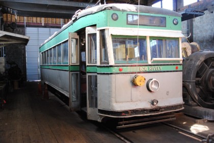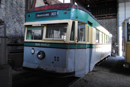 Yakima Valley Transportation double-truck streetcar 22, built by J.G. Brill in 1930. It was one of three Brill Master Units built new for the YVT and operated in Yakima until 1947 when it was sold to the Portland Traction Company and ran there until 1958. 22 was then sold to Robert Hively and displayed at the Puget Sound Railway Historical Association museum in Snoqualmie, Washington and returned to Yakima in 1989. It is presently awaiting restoration to operating condition.