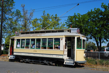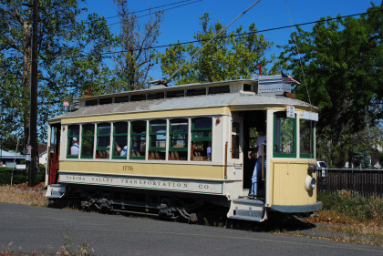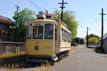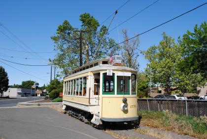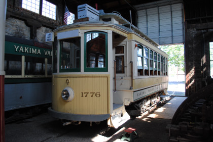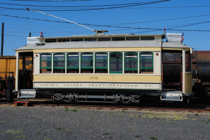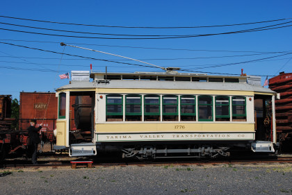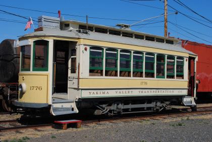 Yakima Valley Trolley single-truck streetcar 1776 built by J.G. Brill in 1928. It is similar in appearance to Yakima's first streetcars. It was built and operated in Oporto, Portugal as streetcar 260 then brought to Yakima in 1974 and was Yakima's United States Bicentennial project. It has remained in continuous operation ever since.
