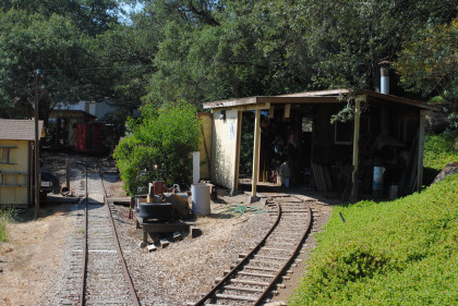Far below is the 18 inch mining railroad on Roy's property. Roy then aligned the switch to take us into his shop area.