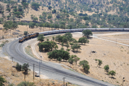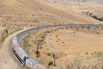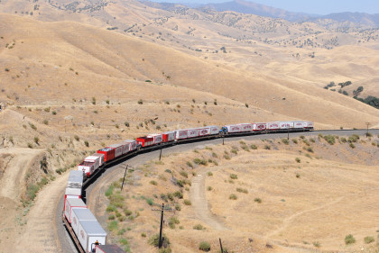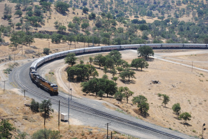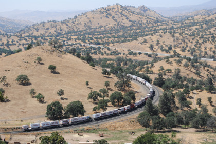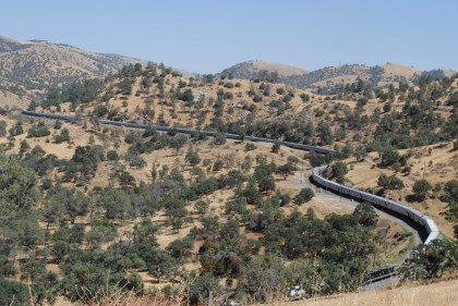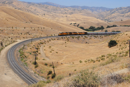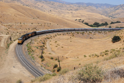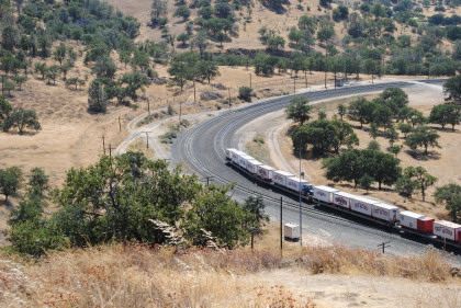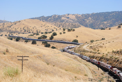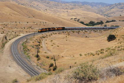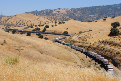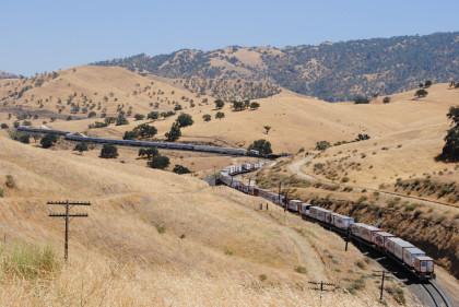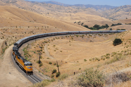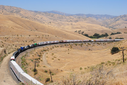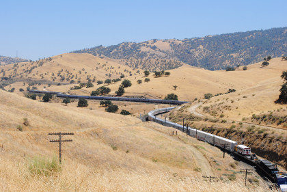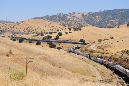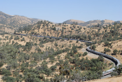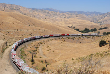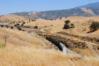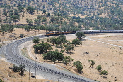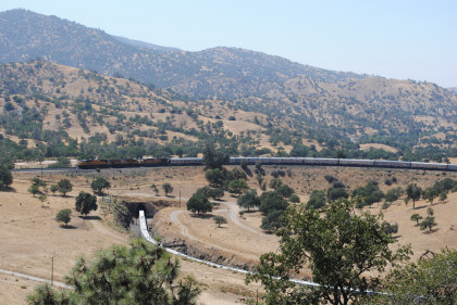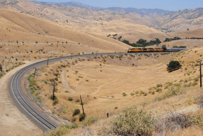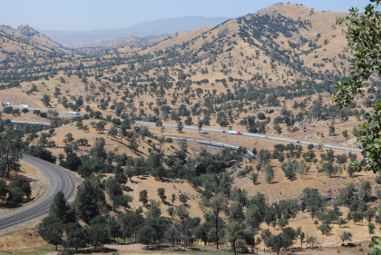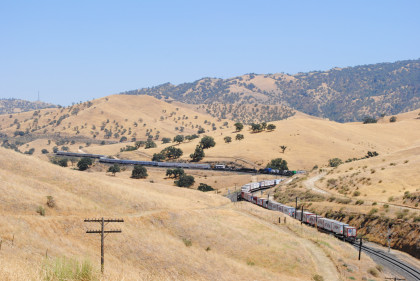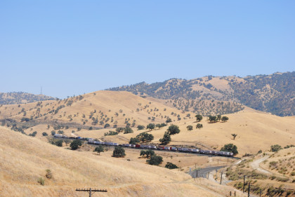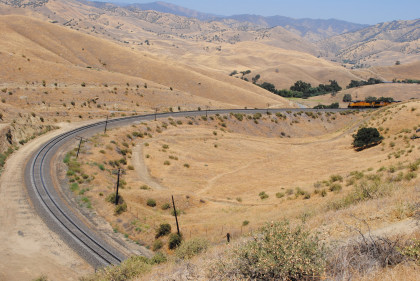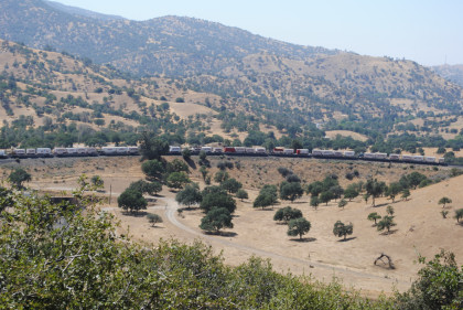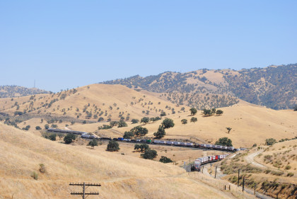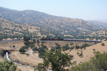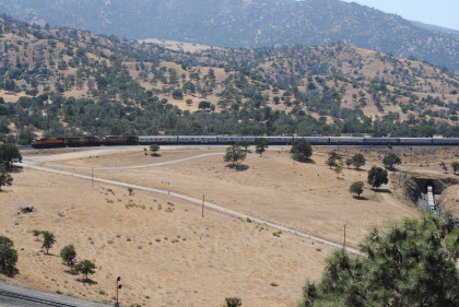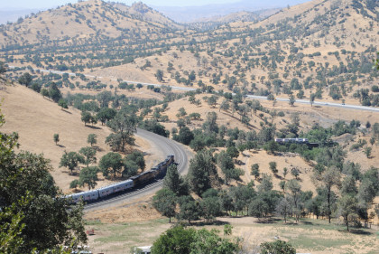 I knew of an accident on Interstate 5 so we took California Highway 57 and Interstate 210 to get to Interstate 5. As we started up the Grapevine, it was 101 degrees outside but as we neared Fraser Park, it was only 86 degrees, and down in the San Joaquin Valley, it was only 94 degrees when we stopped at the Subway at Laval Road. I called Winston Walker to see if there was an update on the train's location and was told 1:40 PM into Bakersfield from a post on Trainorders.com. We drove north to 7th Standard Road and crossing the Union Pacific, saw a headlight coming.