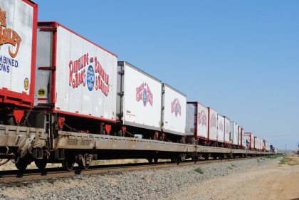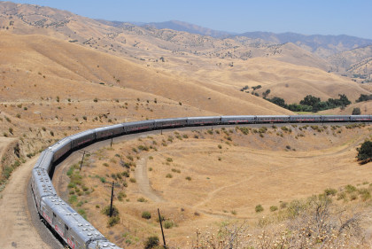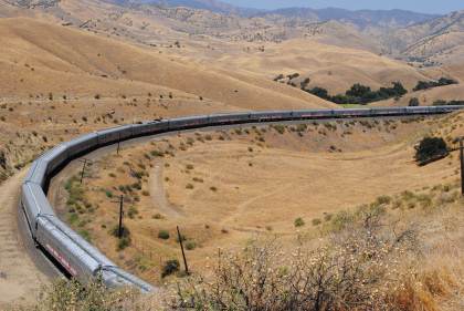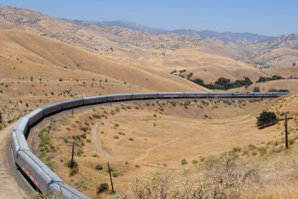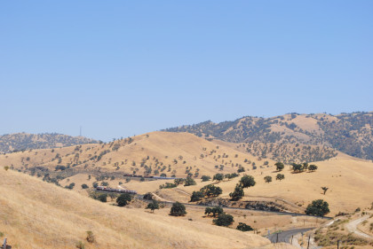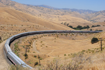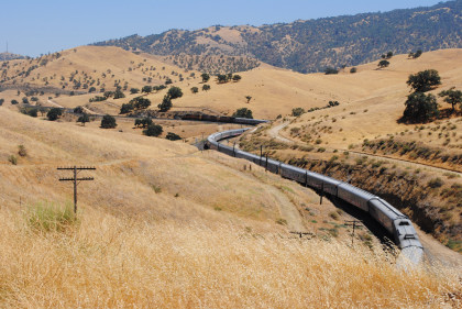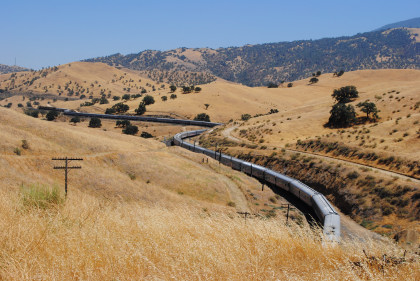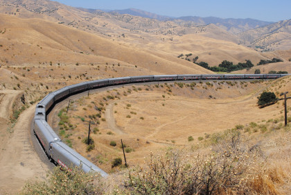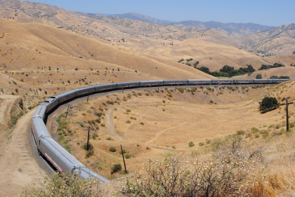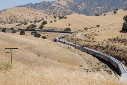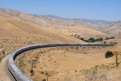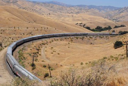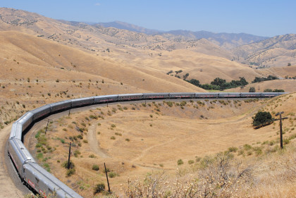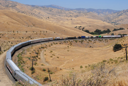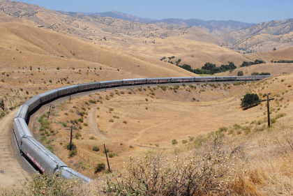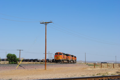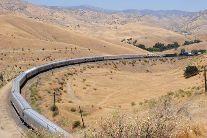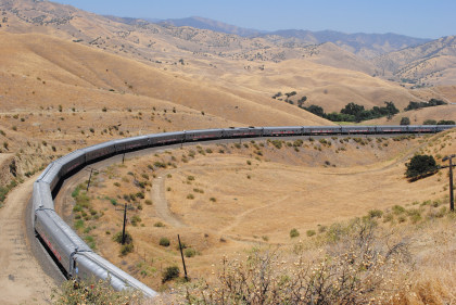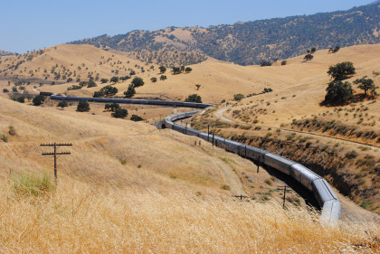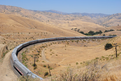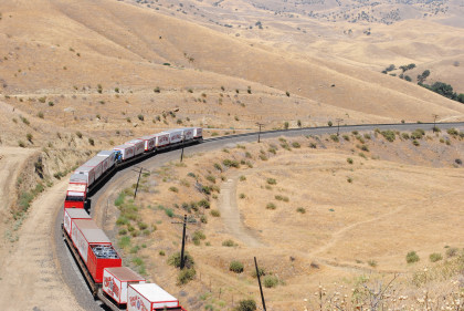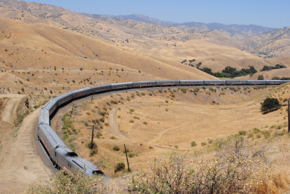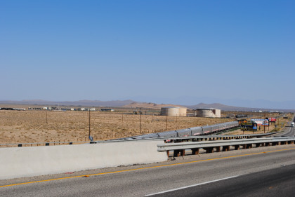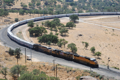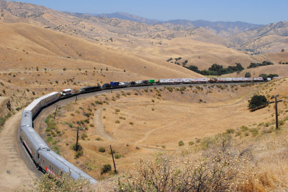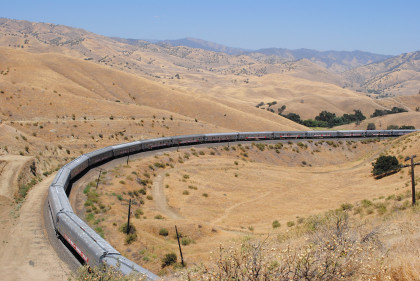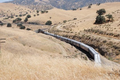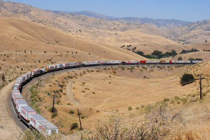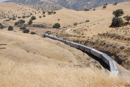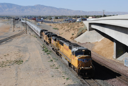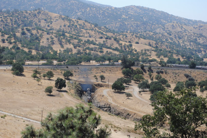 I knew of an accident on Interstate 5 so we took California Highway 57 and Interstate 210 to get to Interstate 5. As we started up the Grapevine, it was 101 degrees outside but as we neared Fraser Park, it was only 86 degrees, and down in the San Joaquin Valley, it was only 94 degrees when we stopped at the Subway at Laval Road. I called Winston Walker to see if there was an update on the train's location and was told 1:40 PM into Bakersfield from a post on Trainorders.com. We drove north to 7th Standard Road and crossing the Union Pacific, saw a headlight coming.
