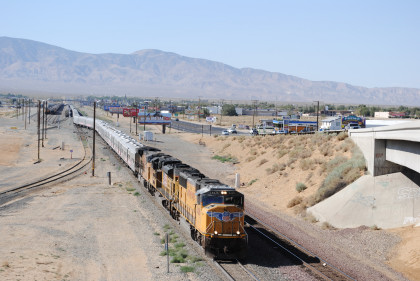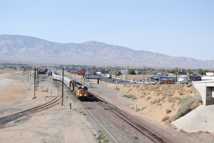 The Blue Unit Circus Train rounded the Tehachapi Loop and headed for Marcel. We drove straight to Mojave where we filled the van with petrol then drove to the California Highway 14 bridge over the mainlines south of town. I went up on the bridge and Carl took his pictures below.