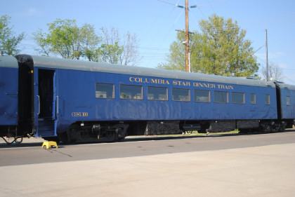 Columbia Star Dinner Train Table Car 100, ex. Grand Traverse Dinner Train 100, exx. Yreka Western, exxx. Amtrak 7529, nee Southern Pacific articulated 2464 built by Pullman-Standard in 1941.
