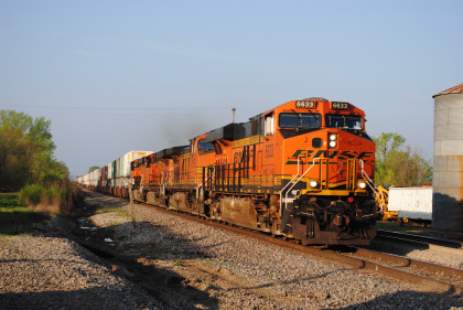 BNSF 6638 East at Elmer. We then drove out to the first old bridge west of Elmer via Route J to Route F, then turned left on Beaver Street and left on Crystal Avenue. With lighting not too good, we returned onto Crystal Avenue, turned left on Beaver Street then left again on Bayport Avenue to the second old bridge west of Ethel.