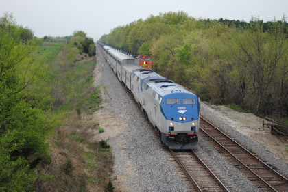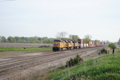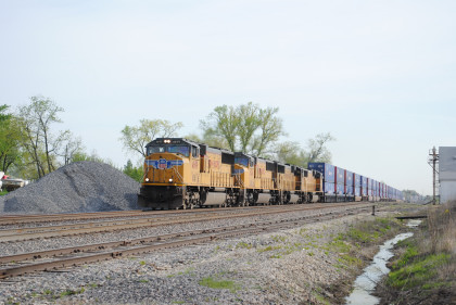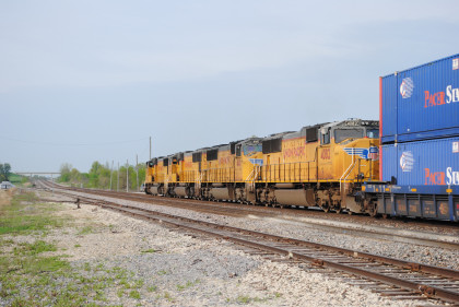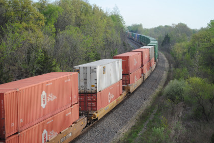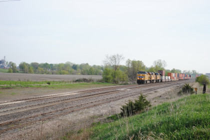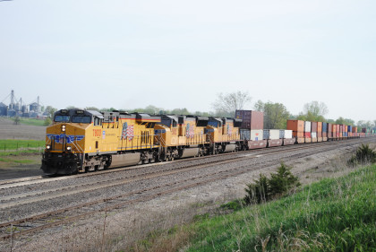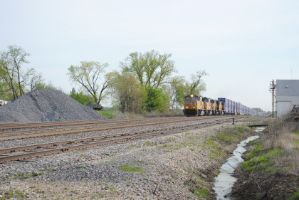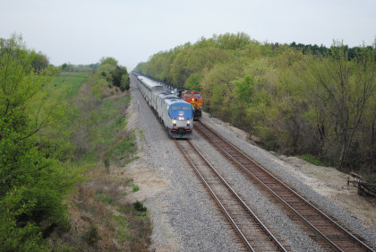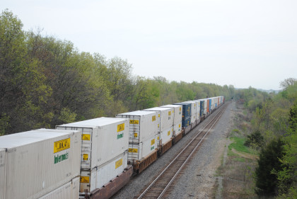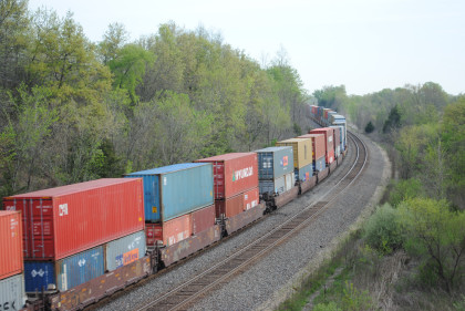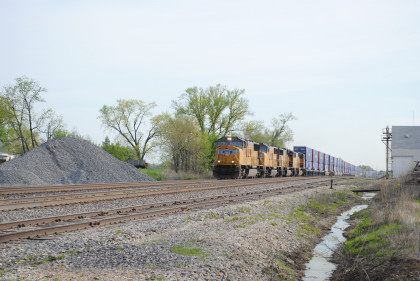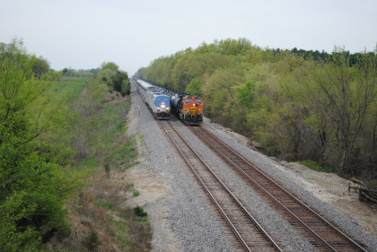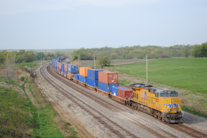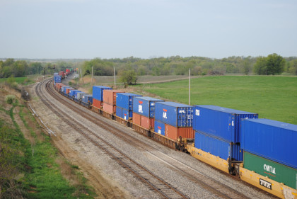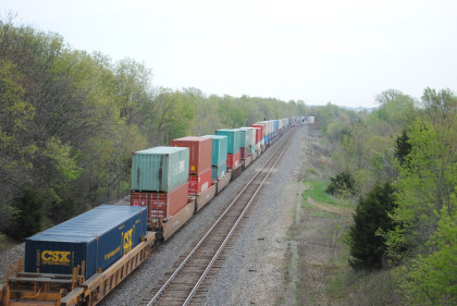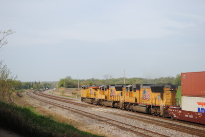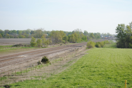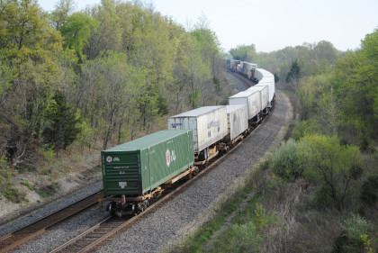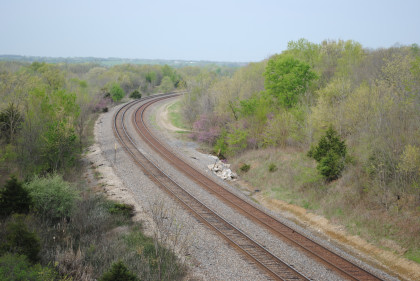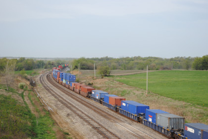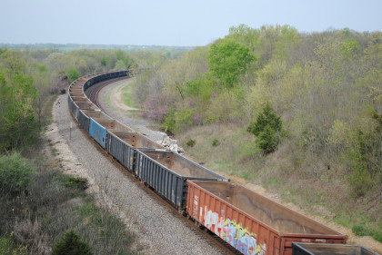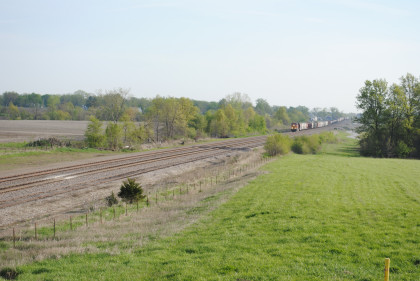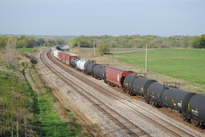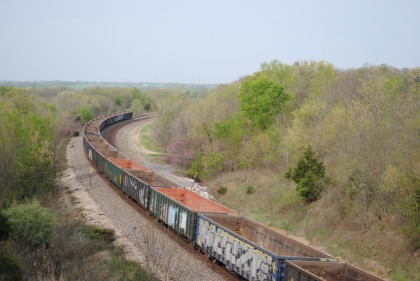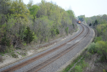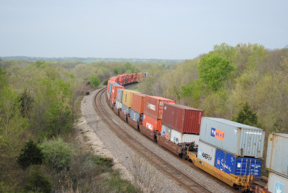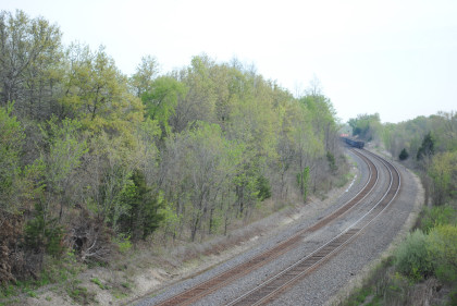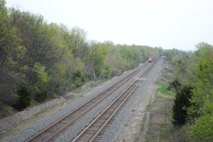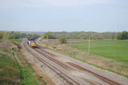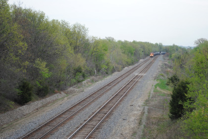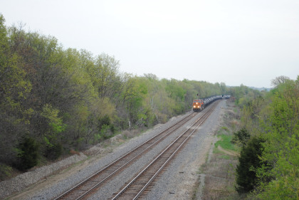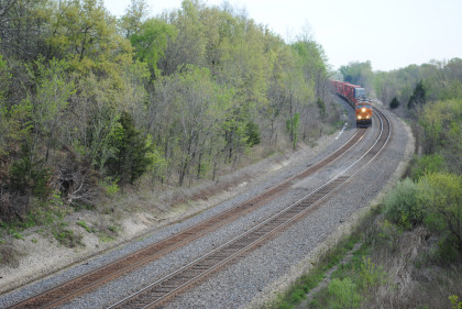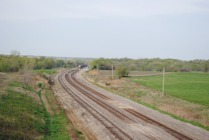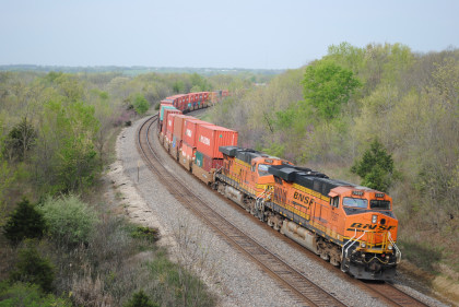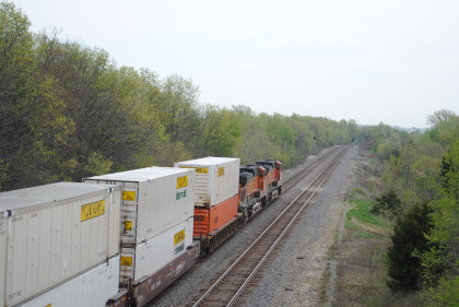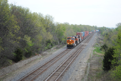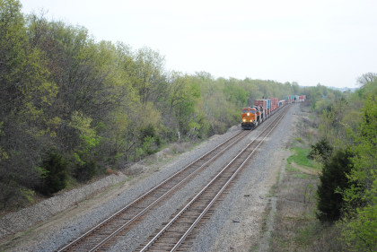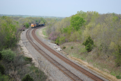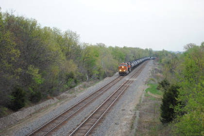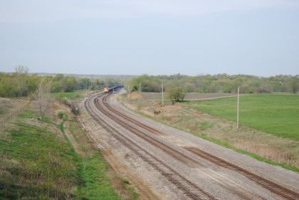 BNSF 4699 West. We then went east on Route K to Route M which we took to Underpass Road to County Line Road, to Road 49 to the old bridge there. We arrived there just as an eastbound Union Pacific train was running through the cut under the old bridge.