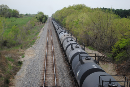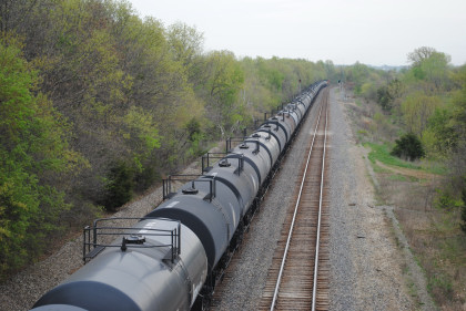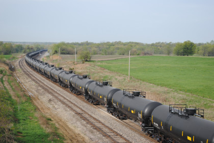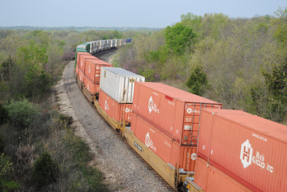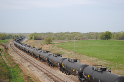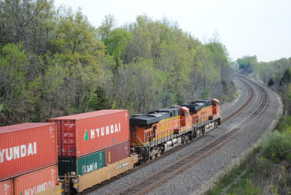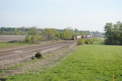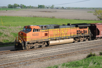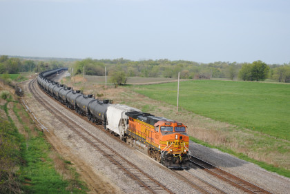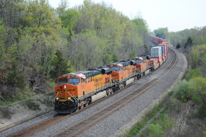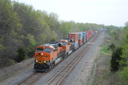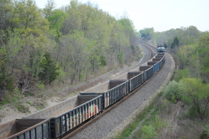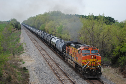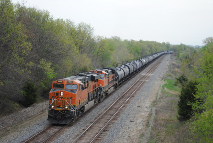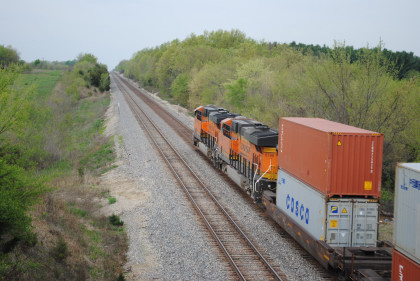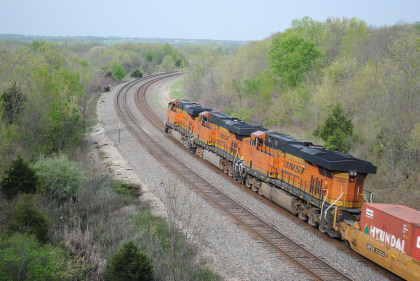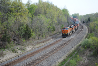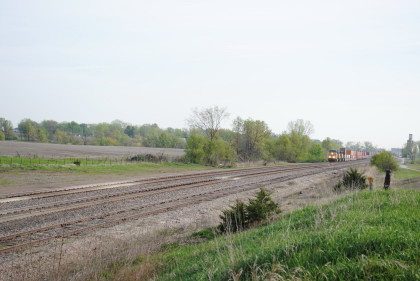 BNSF 5003 East. From here we back-tracked north to Route K and at the Baring grade crossing, saw a headlight coming.