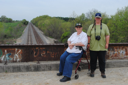 BNSF 7297 West. The three of us returned to Route M to Route A to Route U, to Route A to Route W to the first left after County Road 404, and went north to the old bridge there just east of Wyaconda. Here we met some new friends from Cedar Rapids.