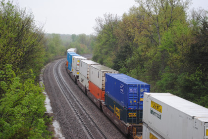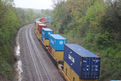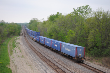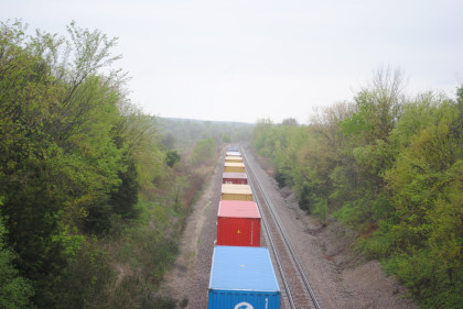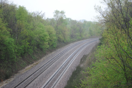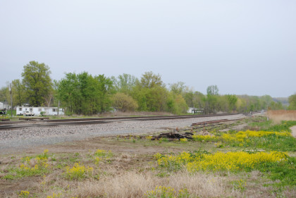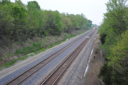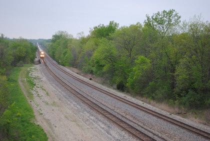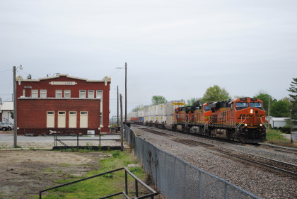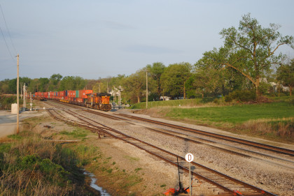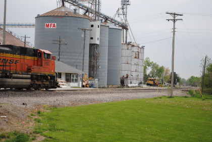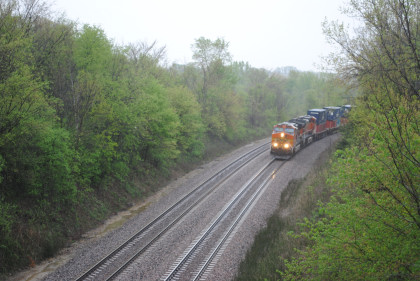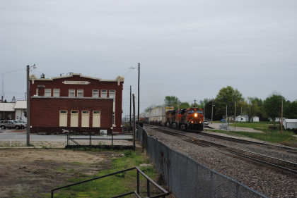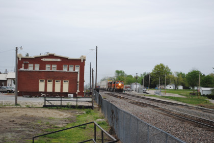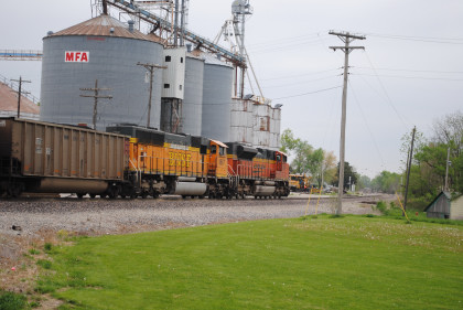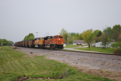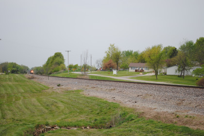 BNSF 7487 West. From Marceline we went out on Missouri Highway 5 to US Highway 36 east to Missouri Highway 129 to Newton Road, which turns into Apple Street, to Anchor Avenue to Archer Street, to Route VV to the bridge there and the rain started.