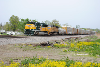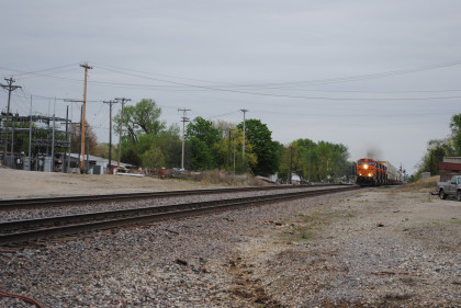 BNSF 7556 West. Here we received a text message from Bob Cox informing us that the Chicago and North Western Heritage engine 1995 was on the point of a westbound coming into Fort Madison and we would set up somewhere to get pictures.