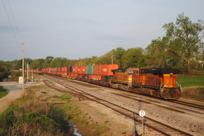 BNSF 6535 west at Ethel. From here we took Missouri Highway 149 to US Highway 36 to Brookfield, where we stopped at McDonald's and I bought hot cakes and sausage. We then returned to US Highway 36 to Missouri Highway 139, going through Sumner to Hale, where I saw a BNSF eastbound train coming.