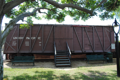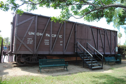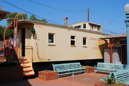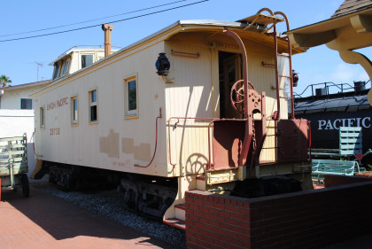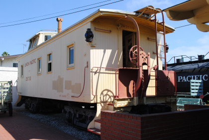 Union Pacific wooden caboose 25730, nee Oregon, Washington Railway and Navigation Company 3579 built by Standard Steel in 1910l. In 1966, instead of scrapping the caboose, the Union Pacific Railroad moved the caboose to Los Angeles, refurbished it and presented it to the Lomita Railroad museum for Christmas.