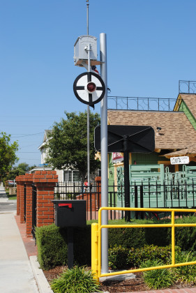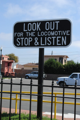 The Look Out for the Locomotive Stop & Listen sign. This ends my coverage of the unique Lomita Railroad Museum. Now Chris Parker and I would drive to ride some new streetcars.