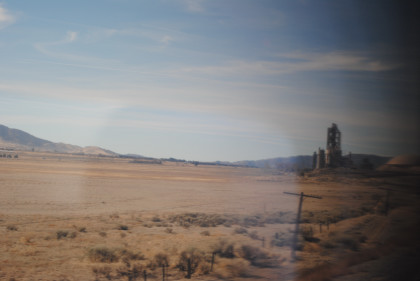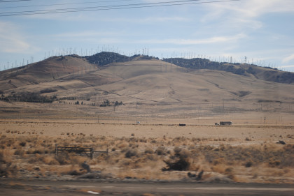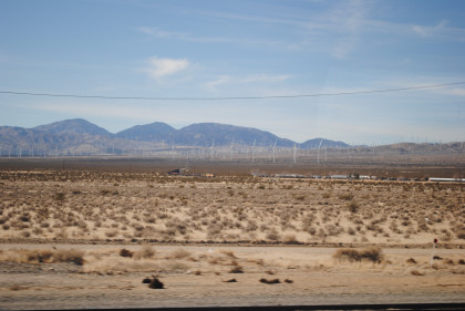 Windmills on the southern ridges as the train ran through Monolith then sprinted across the valley to the summit of Tehachapi Pass at 4,065 feet. From here it was downhill all the way to Bena.