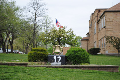 A locomotive bell in front of Marceline High School.