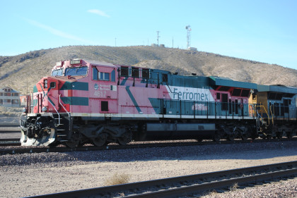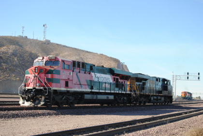 At Barstow, Ferromex ES44AC 4617 built by General Electric in 2006, was with CSX ES44DC 5497, built by General Electric in 2007, before they reversed into the Barstow Yard.
