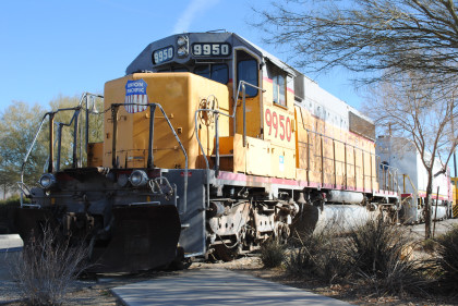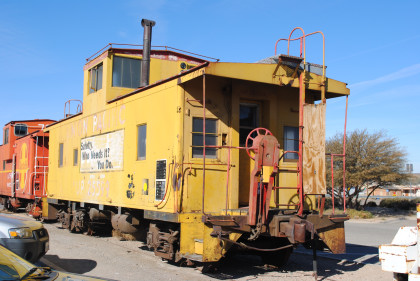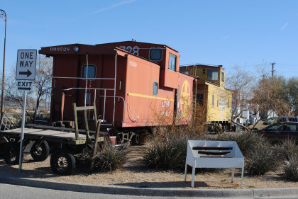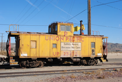 Union Pacific caboose 25472 built by the railroad in 1959 and after retirement in 1987, donated to the Kelso Depot Organization in Kelso, California then between 2006 and 2009, moved to Western America Railroad Museum at the former Fred Harvey restaurant at Barstow.