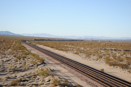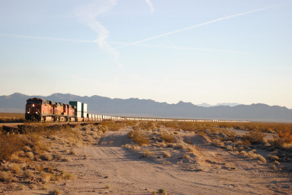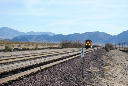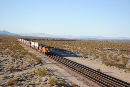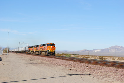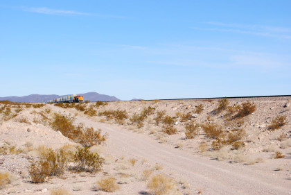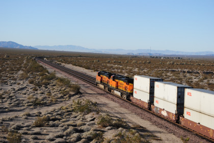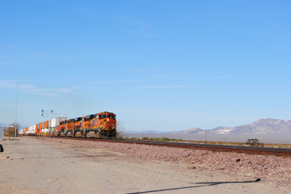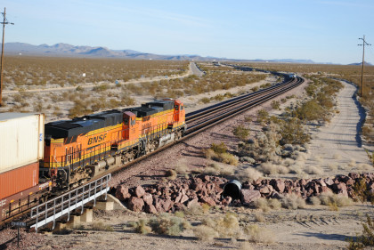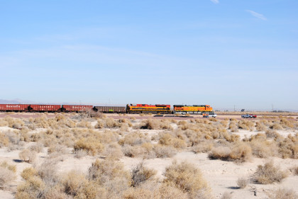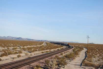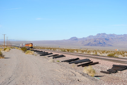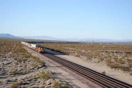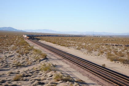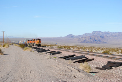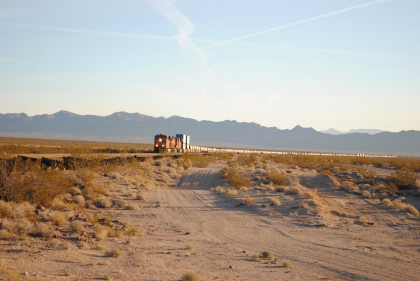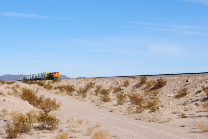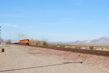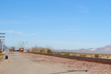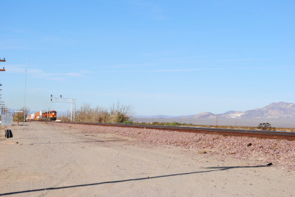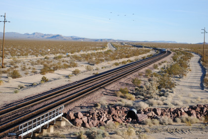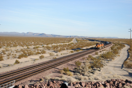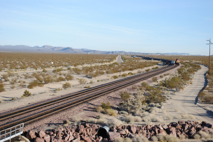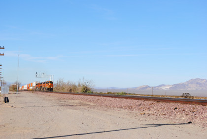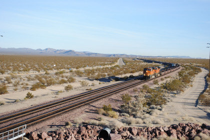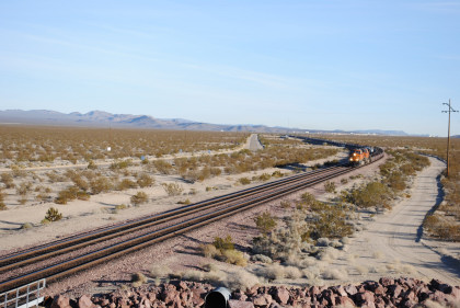 We packed up at the Needles Motel 6 and after checking out, went to McDonald's where I had hot cakes and sausage. Just as we were leaving Needles, a westbound BNSF stack train left as well. We took Interstate 40 to US 95 north and west on Goffs Road and passed the stack train before we crossed over the tracks west of Needles, and a BNSF baretable train near Ibis. We headed west out into the morning bright desert light and set up.