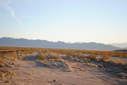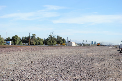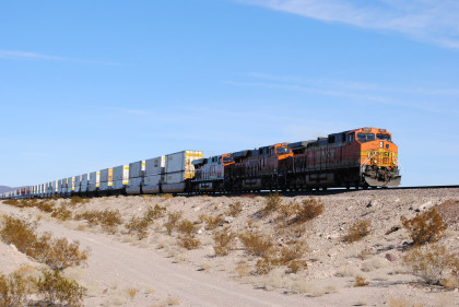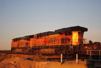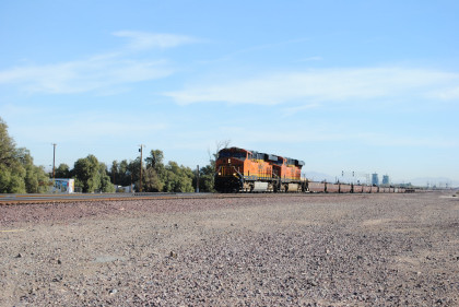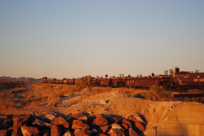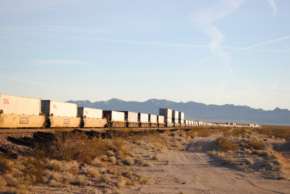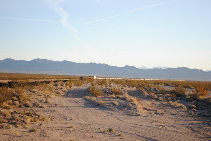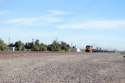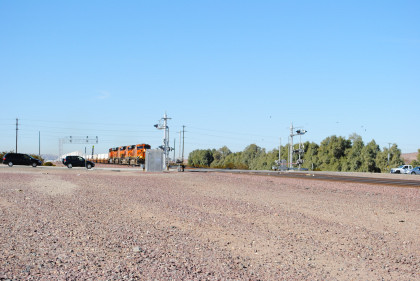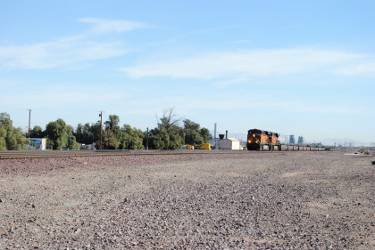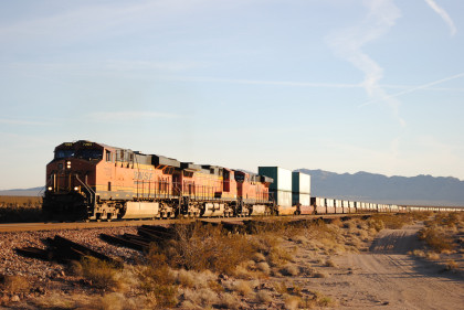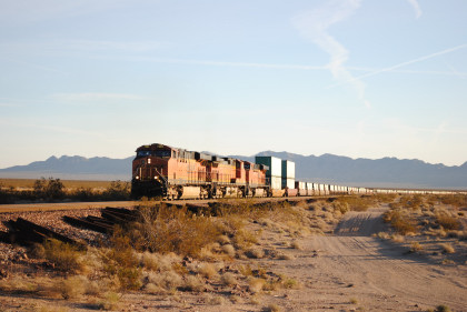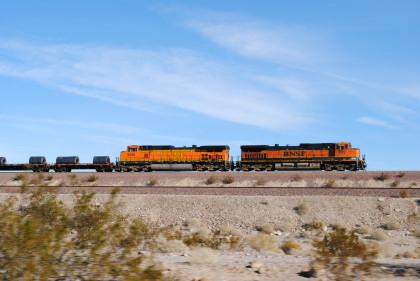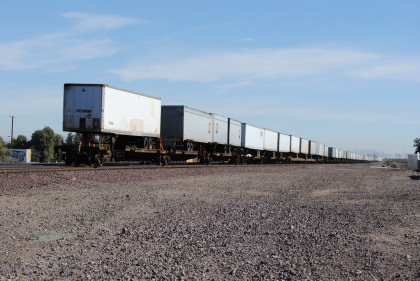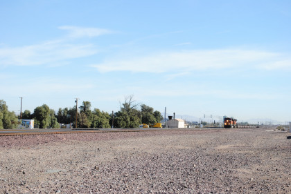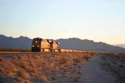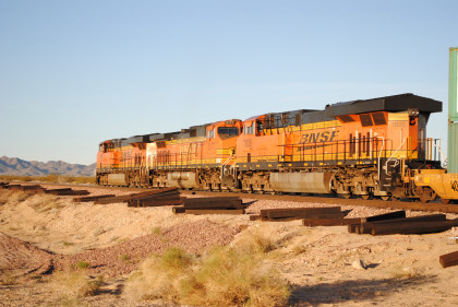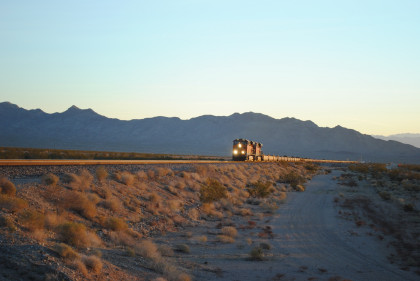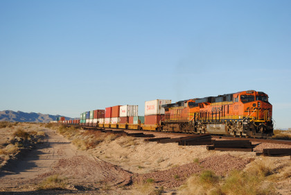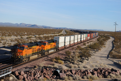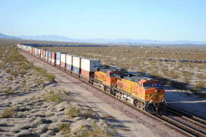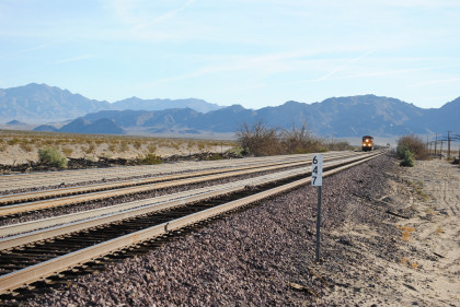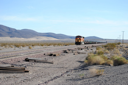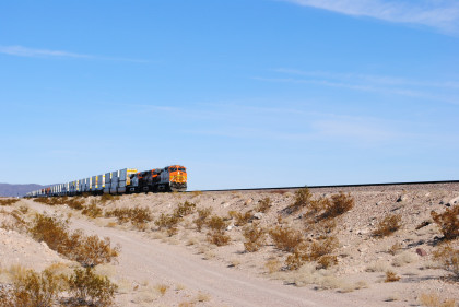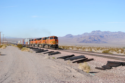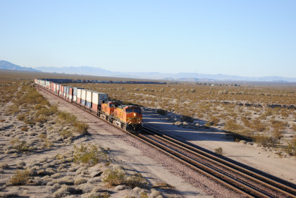 We packed up at the Needles Motel 6 and after checking out, went to McDonald's where I had hot cakes and sausage. Just as we were leaving Needles, a westbound BNSF stack train left as well. We took Interstate 40 to US 95 north and west on Goffs Road and passed the stack train before we crossed over the tracks west of Needles, and a BNSF baretable train near Ibis. We headed west out into the morning bright desert light and set up.