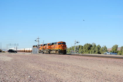 BNSF 7293 west with that stack train, From here we headed through Goffs to the highway bridge at Essex but on the way, passed a BNSF high rail truck on the north track so this was going to become interesting.
