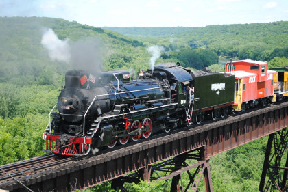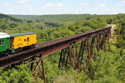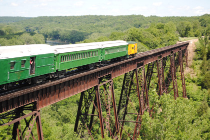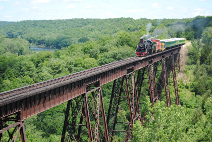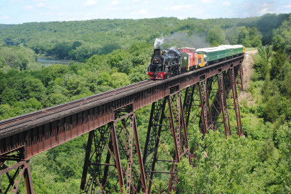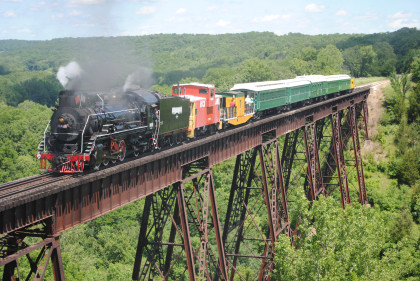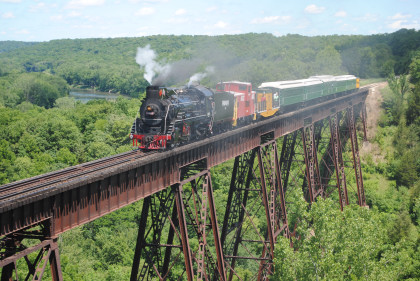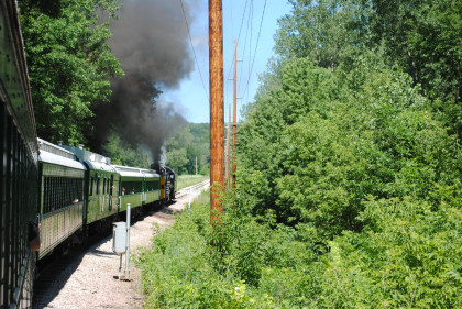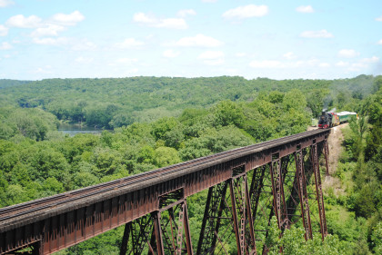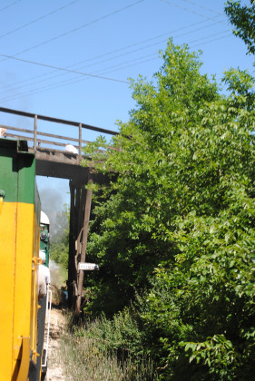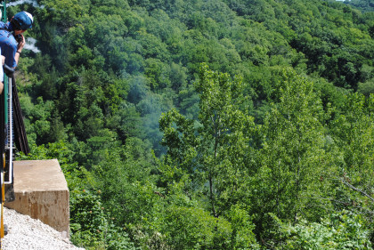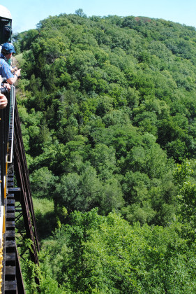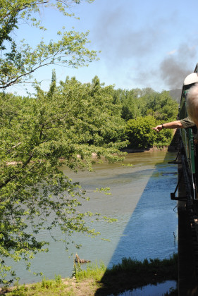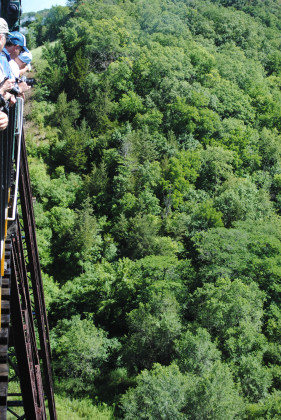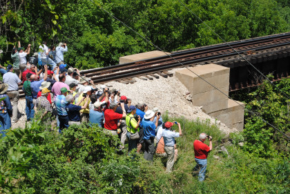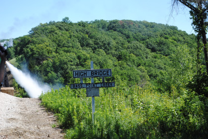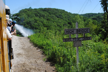 The photo runby where it rained cinders on everyone. We reboarded, and on the way had a meeting about our next photo runby at Bass Point Creek High Bridge. Three photo spots were chosen and I was assigned Safety Duty on the overlook. I was assigned one other person and we would have a group of 18 up for each runby, making sure everyone would be safe and follow directions.