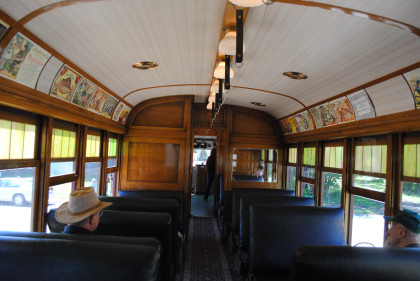 The car was in excellent condition, probably never having spent a night outside its regular storage barn. The car had been painted inside with a light green latex paint, so popular in the 1950's and 1960's. The restoration of Car 50 involved removal of the old paint and varnish, uncovering the beautiful oak woodwork and paneling that you see today. Three coats of varnish were added. The car has been completely re-wired, and seats were found to replace those sold years ago. The old window glass was replaced with safety glass. The stained glass in the upper sash is the original as found in the car.