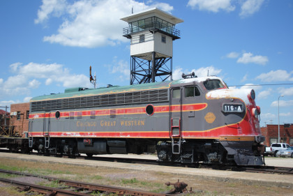 This museum was originally the home of Wells Fargo and Company Express, built in 1912. In 1918, the express company was acquired by the American Railway Express Company as part of a consolidation movement and in the 1930s became the Railway Express Agency (REA). The yard office and yard tower were the heart of the Chicago Great Western in its heyday. The tower, which was built in 1953, provides an outstanding view of the former CGW switching yards. Much of the interior of these building is as they were when vacated in 1969.
