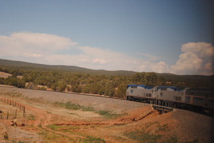 The train crossed the Rio Grande River before we arrived at Albuquerque early this late morning. Randy Jackson came down to visit me while I was here during our station stop. It was in the low 90's and soon I was back on the train listening to my CD of John Cougar "Scarecrow" as the train departed on time with Lilian as our new Sleeping Car Attendant. At 12:30 PM, I was called into the dining car and seated with a couple going to Branson, Missouri. I had the Angus beef burger, which was excellent, and vanilla ice cream. Slow orders were at the Devil's Spine and MP 850 with a 10 MPH speed restriction that the State of New Mexico had imposed while they were fixing the track. I put on my DVD of the Keith Emerson Band "Moscow" which took me to Lamy and beyond.