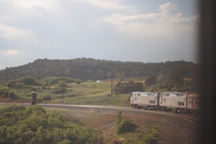 The Southwest Chief descending Wooten Curve on Raton Pass. At 6:15 PM, I was called into the dining car and was seated with two gentlemen going to Galesburg, Illinois. I had the flat iron steak and vanilla ice cream and finished my dinner by Trinidad then watched my Led Zeppelin DVD that took me over to La Junta.