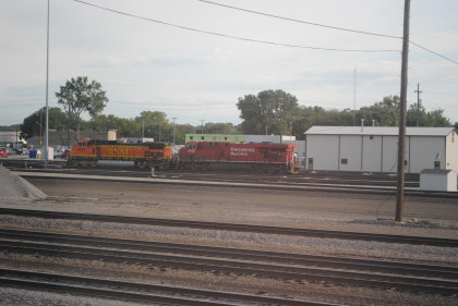 6/15/2012 I was up before Holiday at 7:00 AM and went straight to the dining car, being seated with a mother and son going to Chicago from Albuquerque, with the son only eating meat. I enjoyed French Toast and sausage patties and while the train was being fueled at BNSF's Argentine Yard, I went downstairs and shaved.