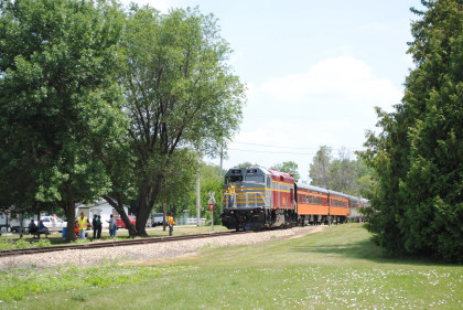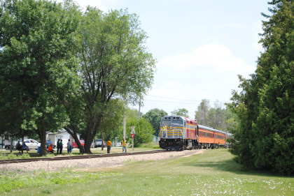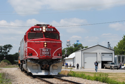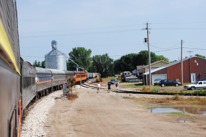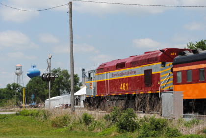 One last view of our train before I went to get lunch. Two ladies in a golf cart gave me a ride to near the front of the food line where I was given a roast beef sandwich and sat out in the Iowa sun on a beautiful early afternoon. After lunch I went through the Manly Railroad Museum then socialized with friends until it was time for our photo runby of the train returning to the boarding area and set up on the west side of the tracks.