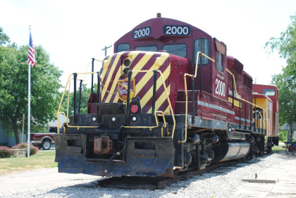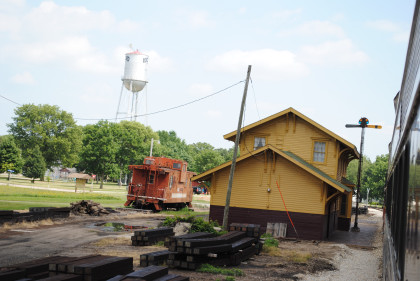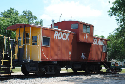 The Rock Island Rockford station built in 1872, home of the Rockford Historical Society Museum, with Illinois Central caboose 9528 built by the railroad in 1968 and lettered Rock Island.